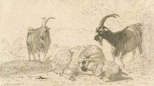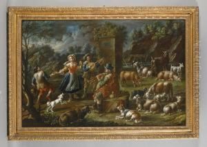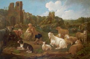 A Shepherd And His Flock Before A Landscape, A Ruined Building In The Distance