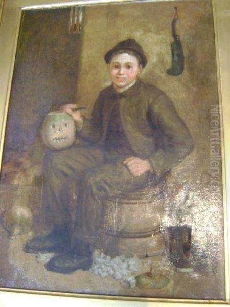 Boy Carving A Turnip Seated On A Barrel Oil On Canvas