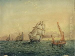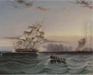 A Three-masted U.s. Merchantman Shortening Sail Off The Americancoast As The Pilot Cutter Approaches Her Starboard Beam