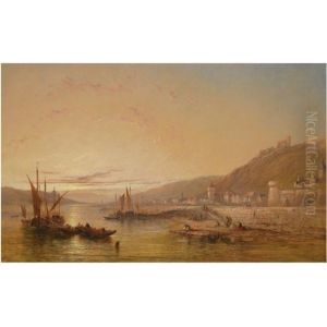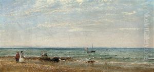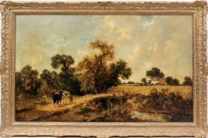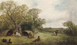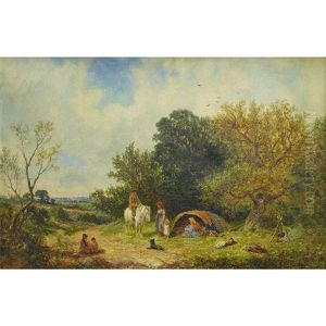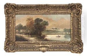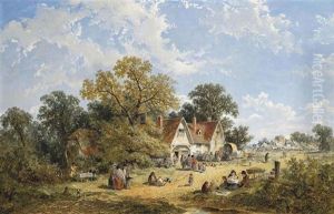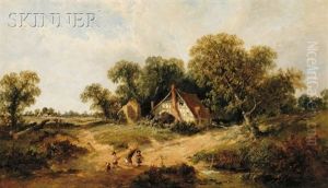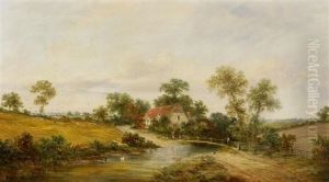 A Rural Scene, Horse And Figures By A Stream, Hay Fields And Cottage Beyond