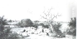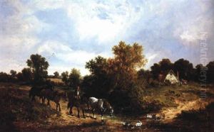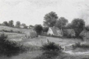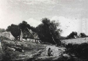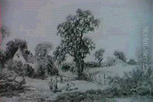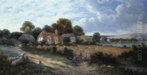 A Rural Landscape With A Drover On A Track Before Cottages