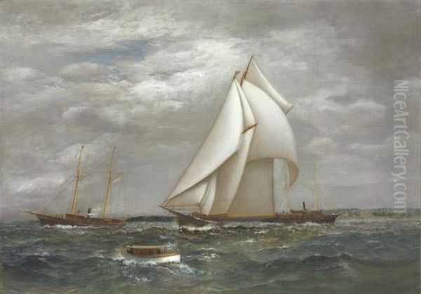 A Centerboard Schooner Of The New York Yacht Club With A Pair Of Steam Yachts And A Small Launch On Long Island Sound