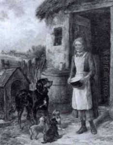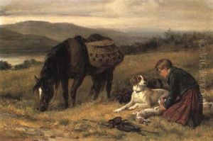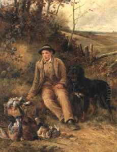 Young Boy With Two Pointers, A Retriever And A Pony By A Stile