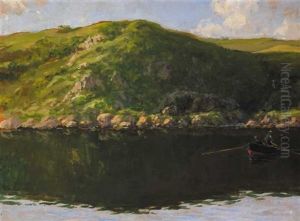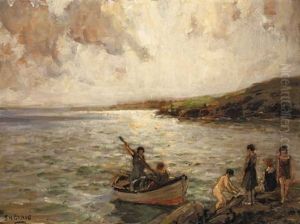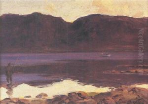 Figures On A Path Before A Cottage, Bay And Mountains Beyond