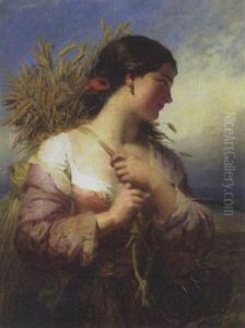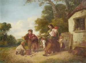 Fishergirl And Her Young Brother Resting On The Coast, A Basket Of Wild Flowers Over Her Shoulder, View Across A Bay Beyond