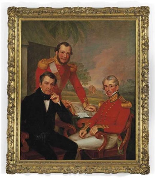 Triple Portrait Of Colonel Sir James Jackson, Major George Lee, And Major General Brice Wakeford Lee, At A Desk In A Landscape, With A Map And A Letter...