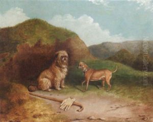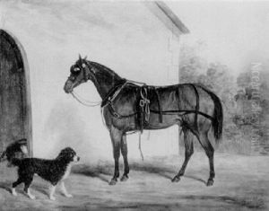 A Bay Hunter Outside A House With A Bull Terrier, A Spaniel And A Pair Of Hounds