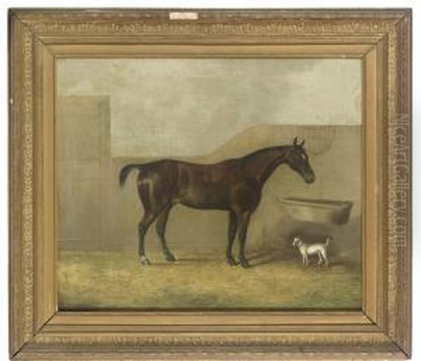 A Bay Horse And A Terrier In A Stable