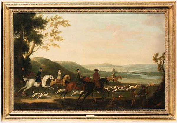 A Hunting Party After A Hare, With An Extensive River Landscapebeyond