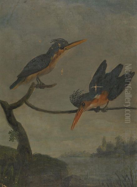 Two Kingfishers beside a Lake Oil Painting by James Sowerby