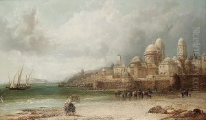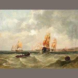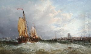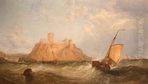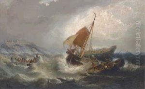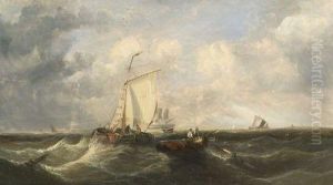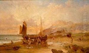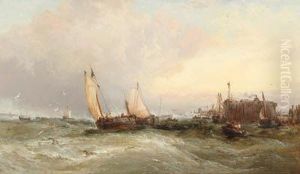 A Coastal Scene With Fishing Boats And A Dinghy, Rough Seas Offshore