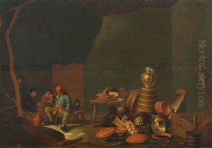 Two Paintings With A Rustic Interior And A Kitchen Still Life