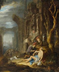 A Hermit At Prayer In A Grotto With Classical Ruins