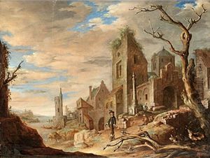 Een biddende kluizenaar in een ruine