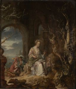 Portrait Of A Girl With Her Dog In A Courtyard, A Landscape With Ruins Beyond