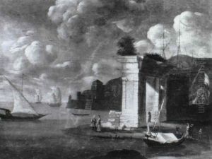 A River Landscape With Many Figures On The Shore, Old Housesto The Left And With A Palace On The Far Bank