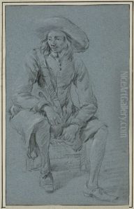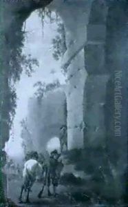 An Italianate Landscape With Travellers Resting By A Pond By Ruins