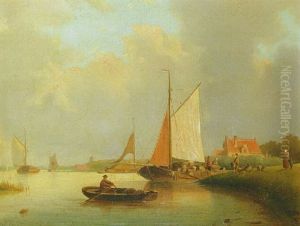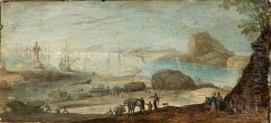A Rocky River Landscape With Travellers In The Foreground And Ships Beyond