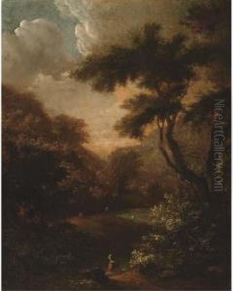 A Wooded Landscape With A Herdsman And A Woman Resting On A Track