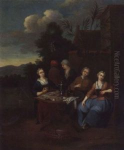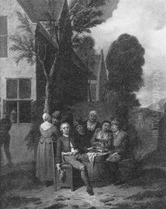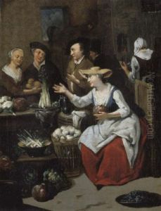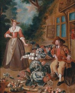 Genrescene Med Maend Og Kvinder Omkring Et Bord Med Grontsager (+ Another Similar; Pair)