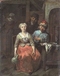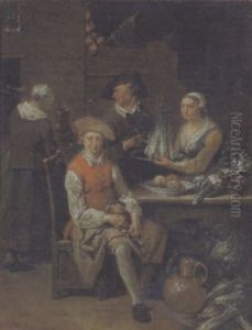 A Tavern Interior With A Gentleman Holding A Pipe And A Maid Holding A Gourd, A Serving Girl Beyond