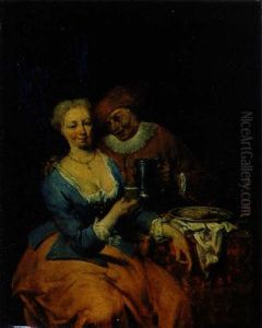 An Elegant Couple And A Servant In An Interior With Wine On A Table (+ A Couple In An Interior With Food And Wine On A Table; Pair)