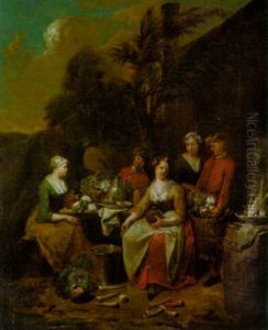 An Elegant Company In A Landscape Amongst Different Fruits And Vegetables, A Man With A Wheelbarrow Entering From The Left (+ An Elegant Company In A Landscape Amongst Different Fruits And Vegetables, A Woman With A Wheelbarrow Entering From The Right; Pa
