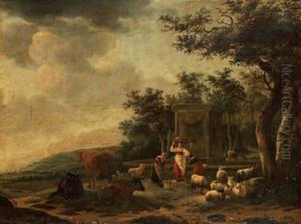 Gardienne Et Son Troupeau Devant Une Fontaine