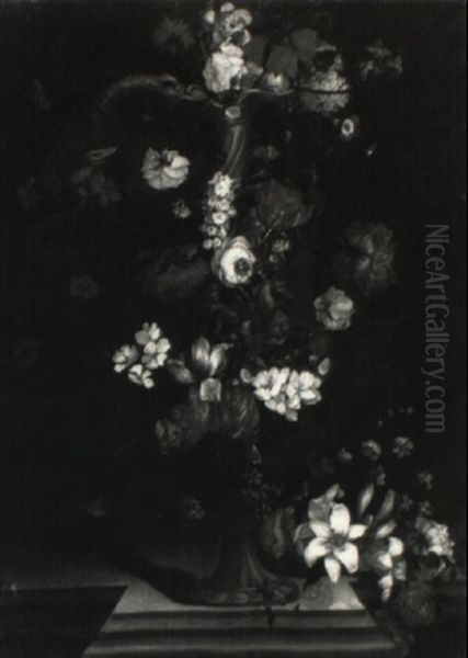 Still Life Of Flowers In Elaborately Sculpted Ewer