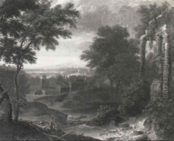 A River Landscape With Classical Ruins And Soldiers Resting By A Tree