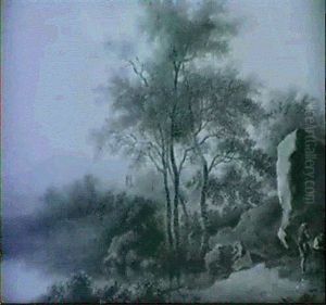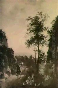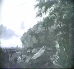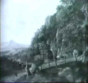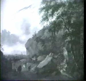 A Rocky Wooded Landscape With Peasants And A Donkey On A Track