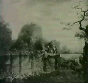 Two peasants with a herd of cattle on a wooded path leading to a lake