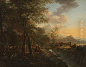 A Mountainous Italianate Landscape With A Horseman And Peasants Resting At Sunset