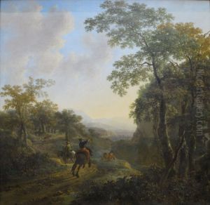 Elegant Figures On Horseback, Riding Through A Rocky Wooded Landscape, A Valley Beyond