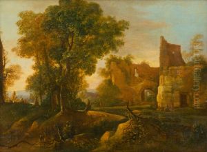Travellers On A Path In An Italianate Landscape With Classical Ruins