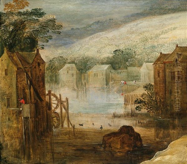 Eine Flusslandschaft Mit Wassermuhle Und Figuren