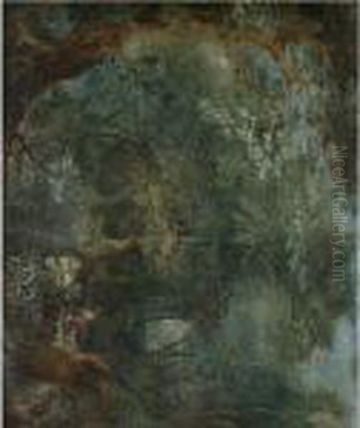 A Wooded Landscape With Two Huntsmen Aand Their Hounds
