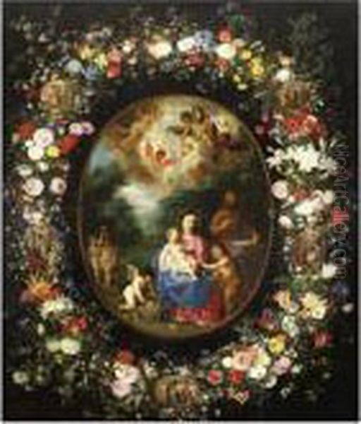 The Holy Family With The Infant Saint John The Baptist And Angels In A Landscape, Within A Garland Of Flowers Containing Medallions With Scenes From The Life Of The Virgin