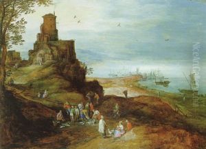 A Landscape With Travellers On The Outskirts Of A Riverside Village