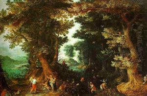 An Extensive Wooded Landscape With A Drover And Peasants On A Track