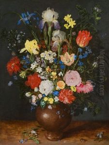Irises, Roses, Tulips, Narcissae, Cardamine, Cyclamen, Hyacinths, Calendula, Eranthis And Other Flowers In A Vase On A Ledge