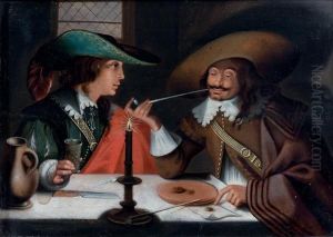 Portrait Of A Gentleman (adriaen Brouwer?) In A Dark-blue Fur-trimmed Coat And A Scarlet Hat, Smoking A Pipe And Holding A Glass