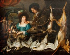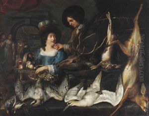 A Man And A Woman With The Day's Hunt, The Head Of A Red Deer, A Hare, A Roe Deer, A Hawk, A Northern Gannet And Fruits Displayed On A Table...