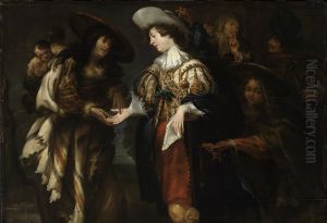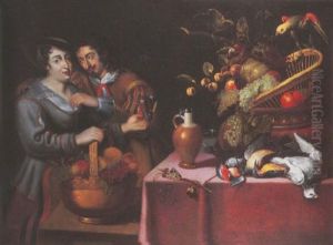 A Gentleman Courting A Maid Holding A Copper Basket And Roemer By A Draped Table With A Basket Of Fruit, Dead Game And A Parrot
