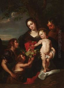 Heilige Familie Und Zwei Hirtenknaben Mit Fruchtekorb Vor Einem Baum