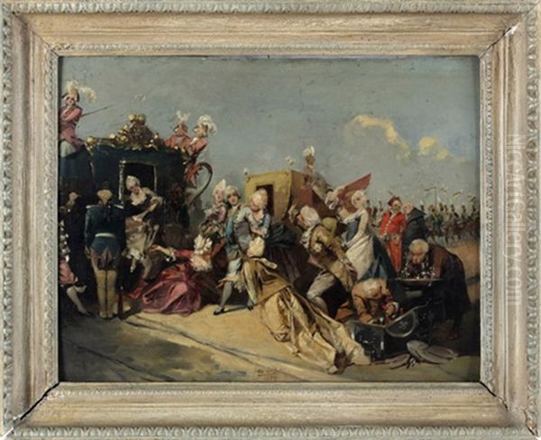 Bring the timeless beauty of Jan Czeslaw Moniuszko's Ankunft Einer Hochfeinen Dame Der Rokokozeit Die Einer Kutsche Entsteigt, Begrust Durch Eine Vornehme Gesellschaft Und Lakaien, Diener Entnehmen Eilig Den Begrusungstrunk Und Glaser Einer Kiste, Bei Der Kutsche Und Im Hintergrund Soldaten into your home with a handmade oil painting reproduction. Carefully recreated on canvas by skilled artists using traditional techniques, this piece captures the delicate brushwork, subtle light, and vibrant color of the original masterpiece. With museum-level quality and rich texture, it brings elegance and artistic depth to any space. Enjoy free shipping and make this masterpiece a part of your personal collection.