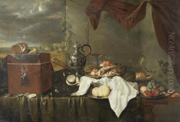 A Still Life Of Shells On A Velvet Covered Box, Beside Oysters, A Silver Ewer, Glasses, Bottles, A White Cloth And Silver Dishes Of Meat And Fruit On A Table Draped With A Green Cloth, Beneath A Mauve Curtain, A View Of A Coastal Landscape Beyond