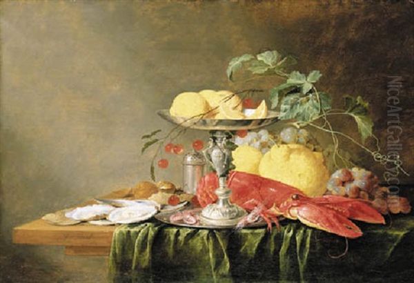 A Silver Tazza With Lemons, A Silver Pepper Mill, A Lobster, Shrimps, Oysters, Nuts, Lemons, Cherries And Grapes On A Partially Draped Table
