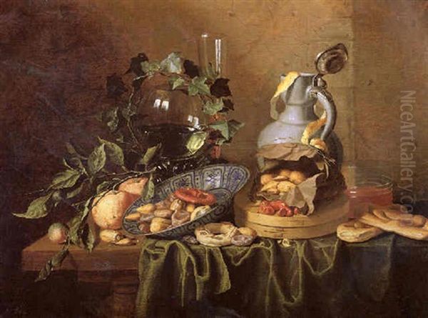 A Still Life Of A Roemer, A Flute, A Jug, Nuts In A Wan-li Porcelain Bowl And Paper Bag, A Glass Beaker, Sweetbread, And Ivy