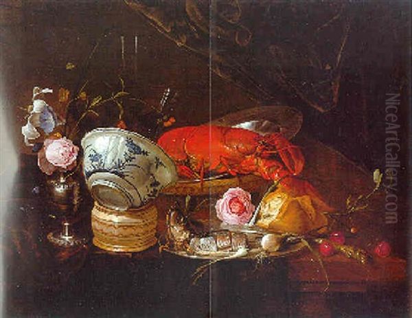 Flowers In A Vase, A Dutch Bowl Resting On An Ointment Jar, And Other Objects On A Table